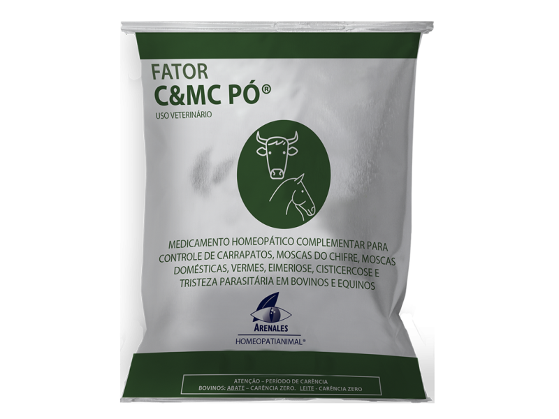 FATOR C&MC PÓ® é indicado como medicamento homeopático complementar para controle de carrapatos, moscas do chifre, moscas domésticas, vermes, eimeriose, cisticercose e tristeza parasitária em bovinos e equinos.